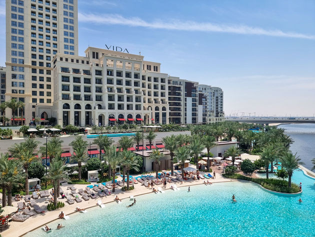 Welcome to Vida Voyage, where luxury living meets coastal elegance within the prestigious Vida Residences. This stunning 2-bedroom apartment boasts panoramic vistas and pristine white interiors adorned with gold accents and vibrant wallpaper, creating an atmosphere of lavish indulgence. Discover the convenience of an open kitchen, perfect for culinary adventures, while private parking ensures effortless access to your coastal sanctuary. You have exclusive access to 5-star amenities, including a cutting-edge pool and fitness center, promising relaxation and revitalization throughout your stay. Begin your day with the serene allure of the Crystal Lagoon, a tranquil oasis. Vida Residences offers an abundance of delightful bars, restaurants, and cafes in close proximity.
